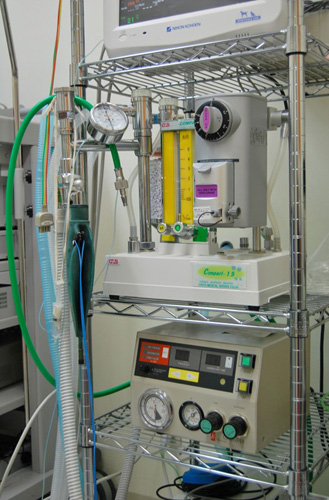 当院では手術中の麻酔にガス麻酔を使用し、より安全で体への負担を少なく麻酔からの覚醒も早い物を使用しております。また人工呼吸器を使用する事で換気の回数、換気圧等細かく調節が可能で最も安全な環境で手術を行える設備を導入しています。 |