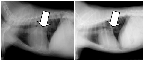 手術前(左)と手術後(右)の胸のレントゲン写真を比べると一目瞭然ですが、心臓のサイズが正常に戻っています。