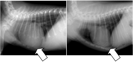 矢印で示された心臓のサイズが目に見えて小さくなっています。