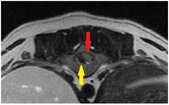 上は左前足と左後足が麻痺して歩けなくなったチワワの首のMRI画像、下が正常な子の画像です。