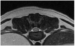 矢印の部分が脊髄ですが、左の画像はより白く映り、炎症が起こっているのが分かりました。 現在は治療によって症状は落ち着いています。 |