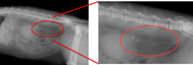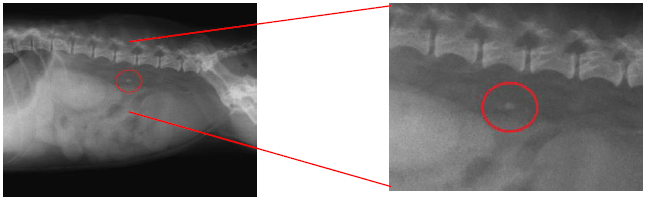 急な吐き、食欲低下、尿が出ない症状の猫です。 レントゲン写真はお腹を横から撮ったものです。 尿管という腎臓と膀胱をつなぐ管がある辺りに、結石の白い影が見えました。 尿の通り道に結石が詰まっている状態です。 |