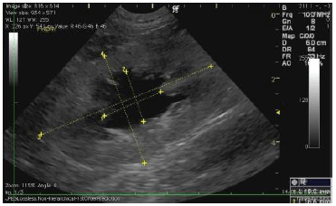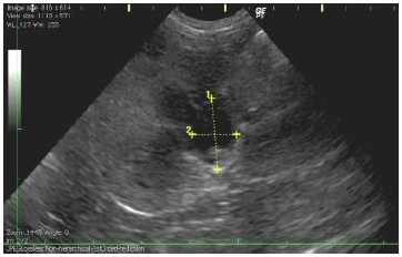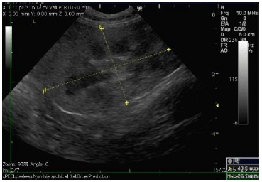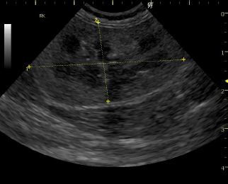 手術後の腎臓の超音波(エコー)画像です。 尿が溜まっていた真ん中の黒い部分が小さくなったのが確認出来ました。 手術後は尿が出るようになり、吐きも止まり、食欲も回復し、現在は元気で快調そのものに暮らしています。 |