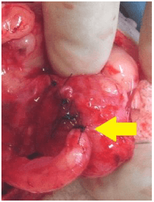 手術は石を取り除いただけでは終われません。 結石が詰まっていた場所は炎症を起こして腫れあがっているため、石が無くても塞がるリスクがあります。 そこで尿管の一部を膀胱へ繋げ、結石のあった場所を迂回する道を作りました。 写真の黄矢印は尿管と膀胱を繋げた場所です。 細かくてよく分からないと思いますが、それくらい小さくて細かいところの手術を手術用の顕微鏡を用いながら行っています。 |
