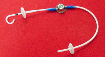 SUBシステムとは、Subcutaneous Ureteral Bypassの略で、尿管結石や膀胱腫瘍などによる水腎症(尿管の通過障害により腎臓が拡張した状態)を呈した症例に対し、水腎症による腎障害の回避や排尿状態の改善を目的として、腎臓から膀胱へのバイパスを形成します。 左側の部分を腎臓に設置し、右下の部分を膀胱内に設置することで、尿管を使わずに直接バイパスさせます。 |